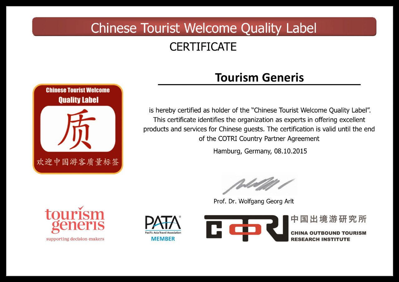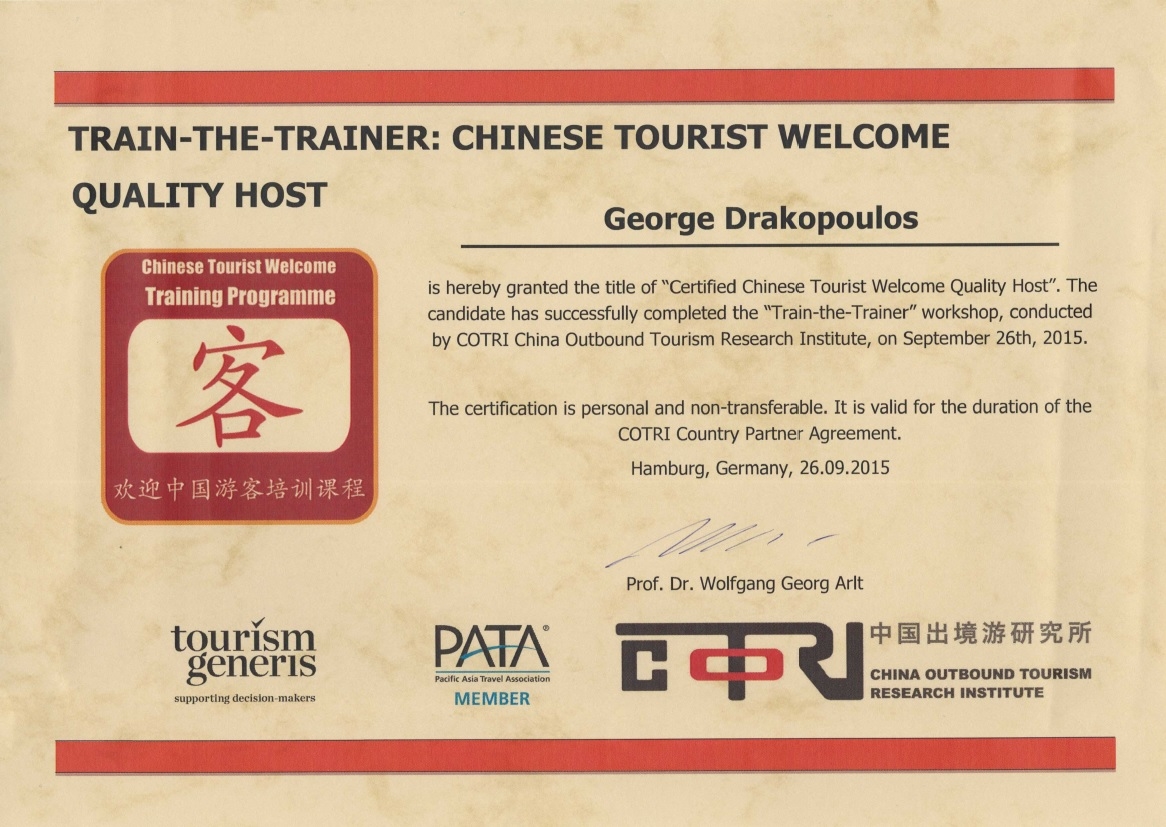 Το Chinese Tourist Welcome Training Programme προτείνεται από την ETC European Travel Commission και την PATA Pacific AsiaTravel Association και έχει βραβευτεί με το GREAT China Welcome Charter Mark του VisitBritain.